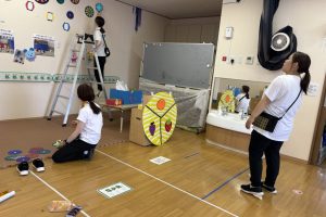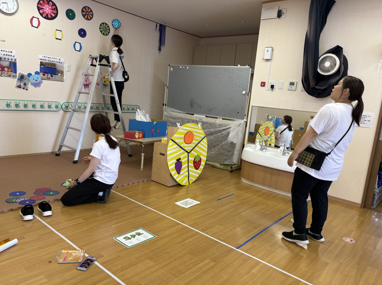 「この辺ですか~?」「うーんもっと右かな」「はいそこ!」年中クラスでの賑やかな準備風景の様子は「ダーツボール」