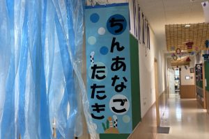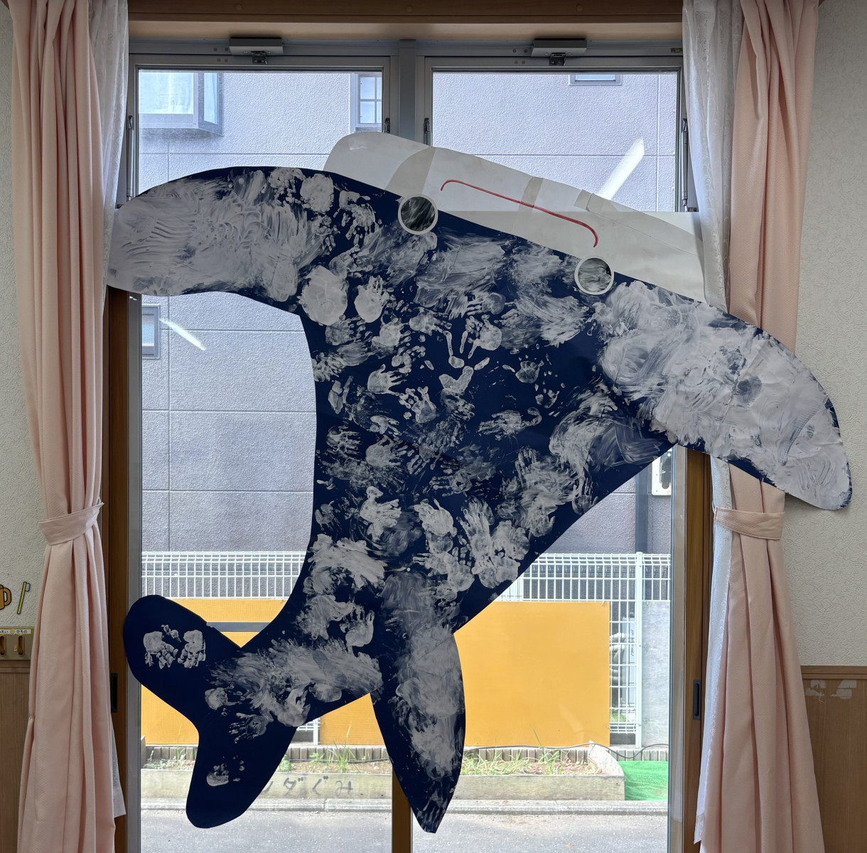 窓いっぱいにちんあなごの友達、サメ君が泳いでいました。子どもたちの手形がいっぱい。準備から楽しんだ様子が伝わります。
